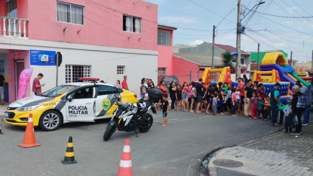 A presença da Polícia Militar, por meio do BPTran, foi um dos destaques da festa. Policiais estiveram no local, interagindo com as crianças, apresentando a viatura de trânsito e participando das brincadeiras. A atitude reforçou o papel da PM como agente de proximidade e confiança com a comunidade.