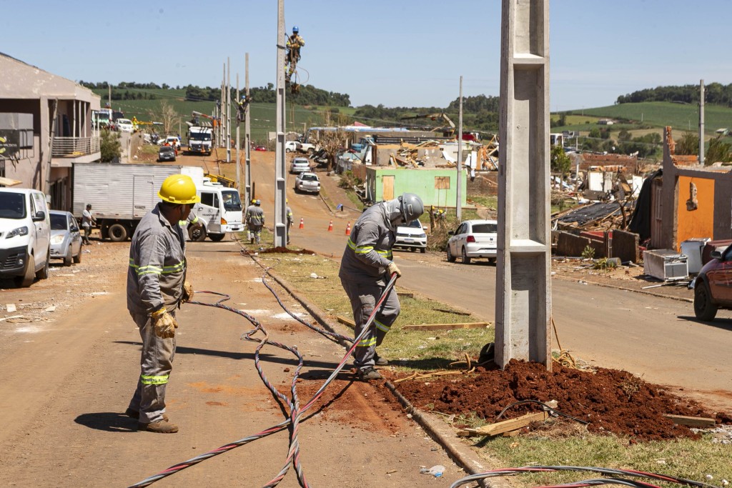 De um total de 1.860 residências vistoriadas, 240 terão o novo padrão de ligação à rede instalado gratuitamente pela companhia. Outros 273 imóveis, totalmente destruídos pela força do tornado, terão a instalação programada. Em 306 residências, em que os padrões permitem conexão, as equipes trabalham no religamento dos ramais à rede elétrica.