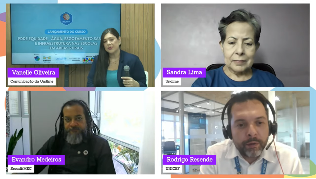 Nesta quinta-feira, 9 de outubro, foi realizada uma videoconferência de apresentação do curso “PDDE Equidade – Água, Esgotamento Sanitário e Infraestrutura nas escolas em áreas rurais”, desenvolvido pelo Programa de Água, Saneamento e Higiene (WASH) do Unicef Brasil em parceria com o Ministério da Educação (MEC), por meio da Secretaria de Educação Continuada, Alfabetização de Jovens e Adultos, Diversidade e Inclusão (Secadi).