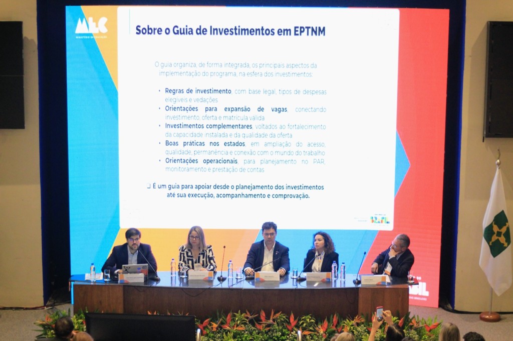O Ministério da Educação (MEC) lançou, nesta quinta-feira, 16 de abril, durante o 2º Seminário Técnico Juros por Educação, o Guia de Investimentos na Educação Profissional Técnica de Nível Médio (EPTNM). O material, que está disponível no portal da pasta, foi criado em parceria com o Banco Interamericano de Desenvolvimento (BID) para apoiar gestores e equipes técnicas dos estados na tomada de decisões relacionadas ao uso dos recursos do programa Juros por Educação. O documento oferece orientações práticas, parâmetros e referências para qualificar os investimentos na modalidade de ensino e para cumprir as metas de desempenho do programa.