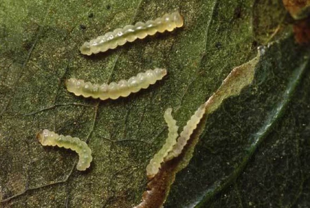 A pesquisadora ressalta que o comportamento protegido das larvas no interior da folha dificulta o controle com inseticidas convencionais.