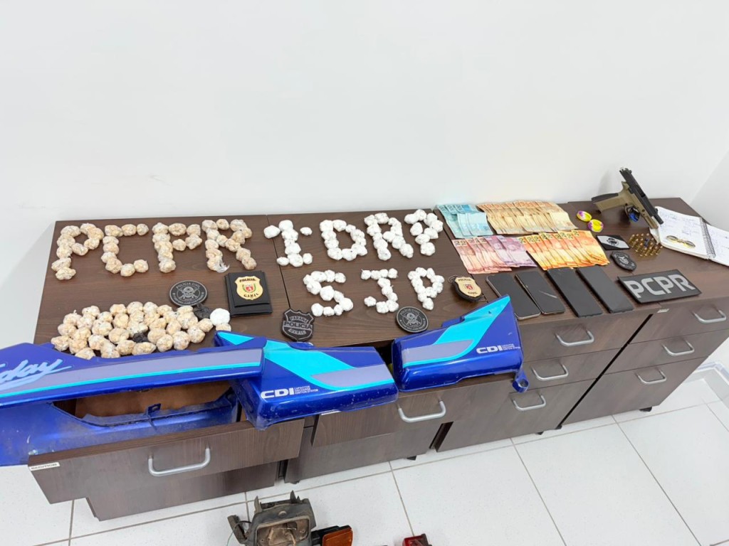 A ação visou o cumprimento dos mandados de prisão dos dois suspeitos, identificados como executores do crime, e de outras seis ordens de busca e apreensão com o auxílio de cães de faro da PCPR. Em um dos endereços, foi apreendida a arma de fogo calibre 9mm utilizada no homicídio, a qual era ostentada em imagens publicadas nas redes sociais.