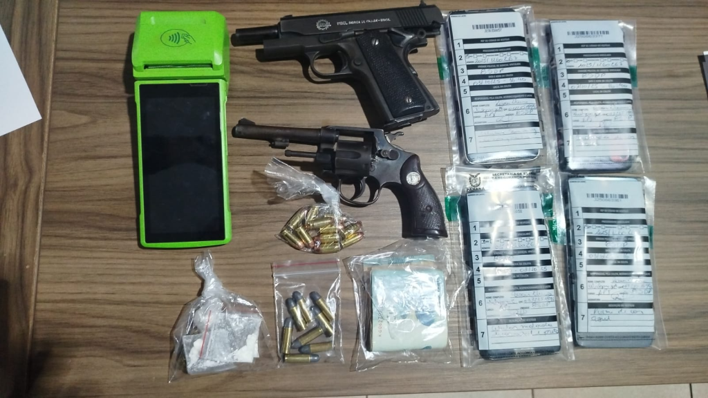 No local, foram apreendidos um revólver calibre .32, uma pistola calibre .380, munições, 10 gramas de maconha e 2,6 gramas de cocaína, além de três celulares, uma máquina de cartão e R$ 589 em dinheiro.