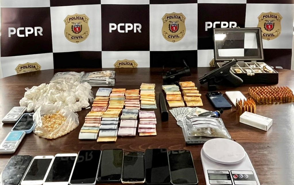 A Polícia Civil do Paraná (PCPR) prendeu duas mulheres e sete homens durante uma operação deflagrada nas primeiras horas desta terça-feira (10). A ação aconteceu em Fazenda Rio Grande, na Região Metropolitana, e em Curitiba, e resultou na apreensão de 2.150 porções de entorpecentes e dólares americanos.