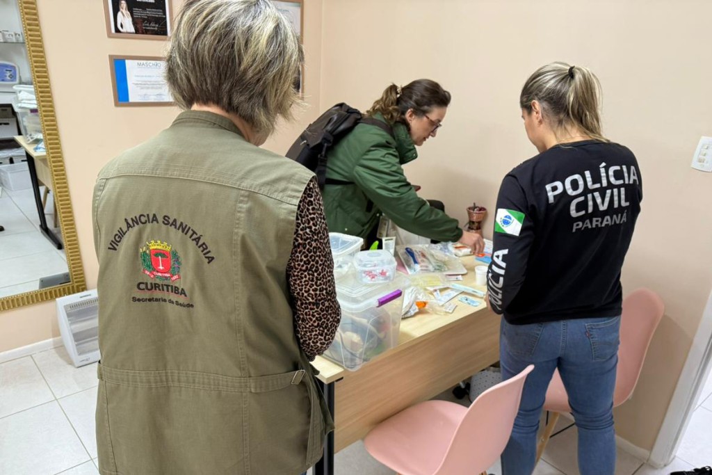 Conforme a delegada da PCPR Aline Manzatto, a ação foi realizada em conjunto com a Vigilância Sanitária de Curitiba e fiscais do Conselho Regional de Medicina do Paraná durante fiscalização em uma clínica de cirurgias faciais.