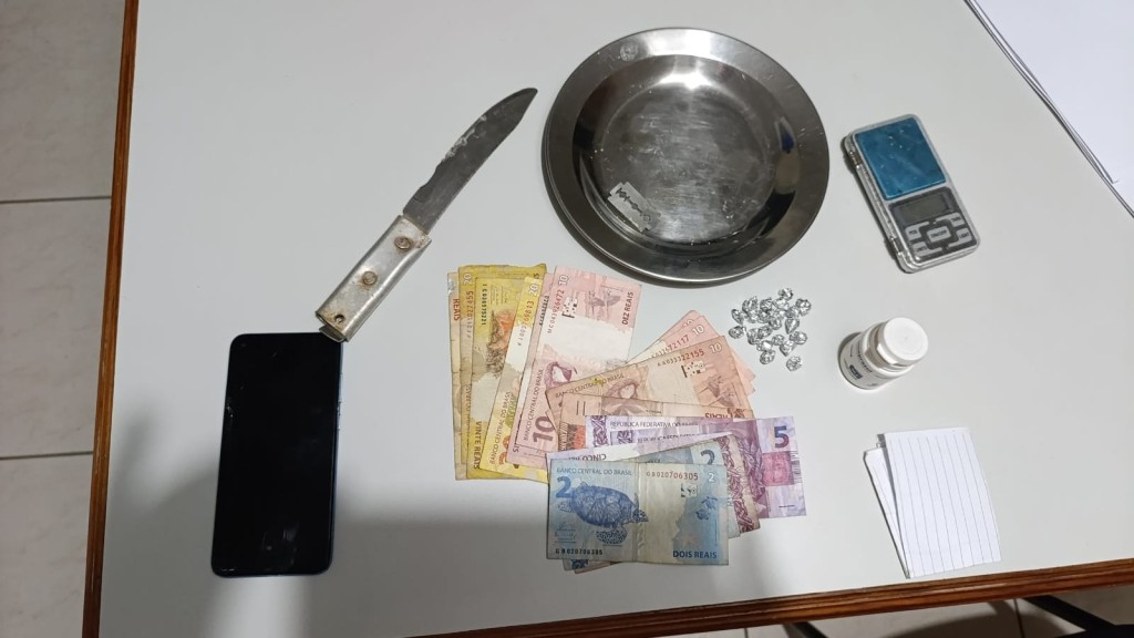 No interior do imóvel, foram apreendidos outros objetos típicos da traficância, como balança de precisão, faca e lâmina com resquícios de entorpecentes.