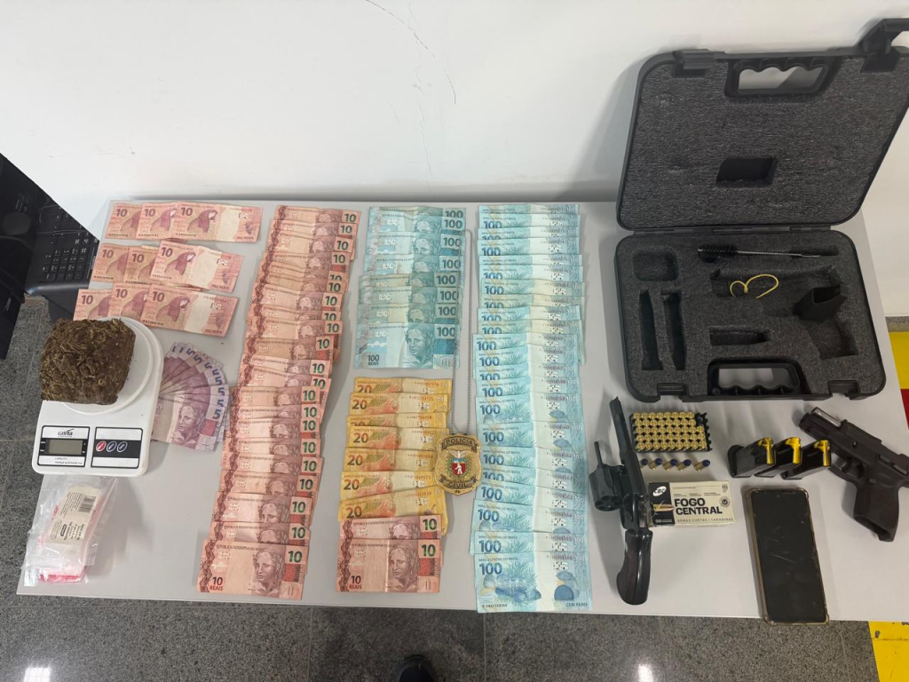 Durante o cumprimento da ordem judicial, foram apreendidos uma pistola calibre 9mm com três carregadores e diversas munições intactas, um revólver calibre .38, aproximadamente 340 gramas de substância análoga à maconha, além de material utilizado para fracionamento de entorpecentes, quantia em dinheiro em notas diversas e um aparelho celular.