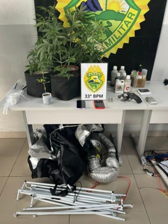 Durante as buscas, realizadas com o apoio do cão policial, foi localizado um revólver calibre .32 municiado com seis munições intactas no tambor. No imóvel também foi encontrada uma estufa utilizada para o cultivo de maconha, equipada com termômetro, contendo sete pés da planta, além de diversas sementes e materiais destinados ao cultivo. As diligências resultaram ainda na apreensão de três comprimidos de ecstasy, um frasco de lança-perfume, uma balança de precisão e dois aparelhos celulares.