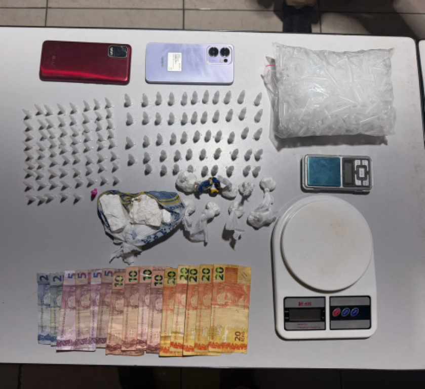 Posteriormente, os policiais realizaram a incursão no imóvel. Um indivíduo tentou fugir ao perceber a presença da equipe, mas foi localizado e detido. Durante as buscas, foram apreendidas porções de cocaína, balanças de precisão, embalagens para fracionamento, dinheiro e aparelhos celulares.
