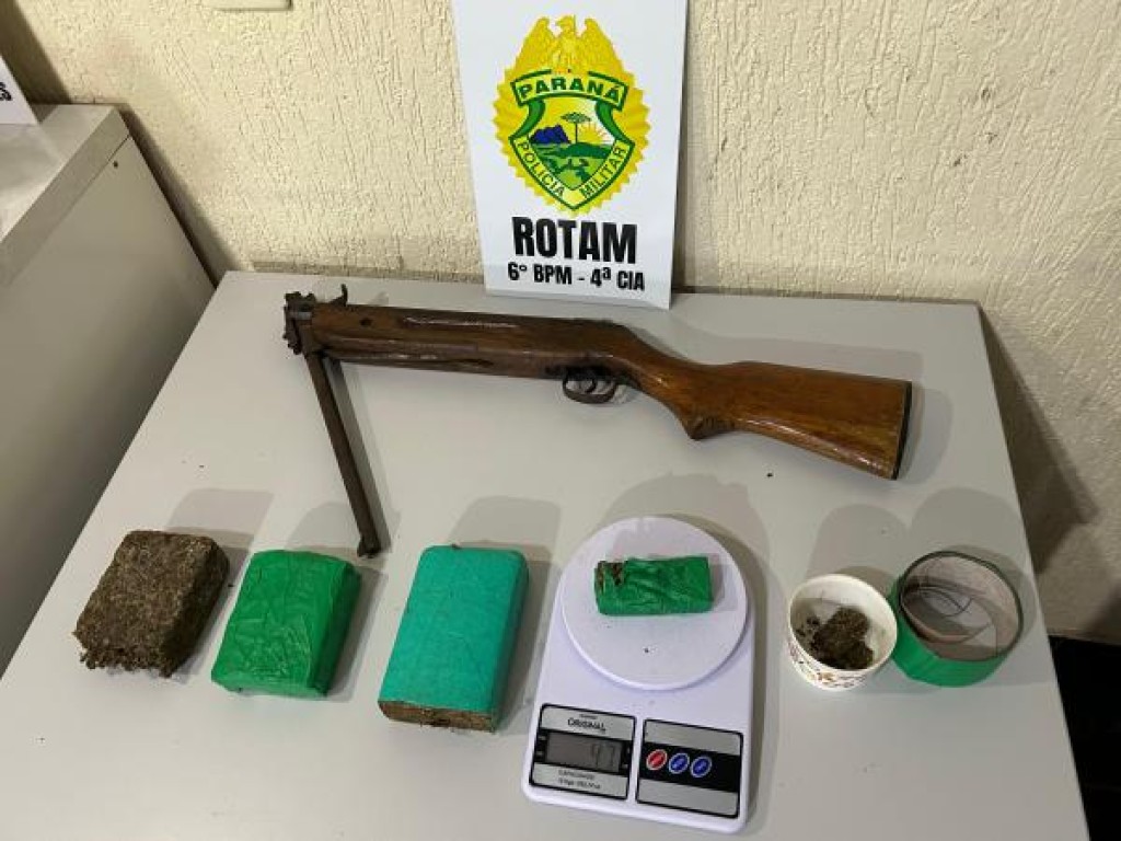 Após o recebimento de denúncias indicando a prática do tráfico na região, a equipe policial intensificou o patrulhamento ostensivo no local informado, logrando êxito na abordagem. Durante as diligências, foram apreendidos aproximadamente 835 gramas de substância análoga à maconha, uma balança de precisão, R$ 69,00 em dinheiro, embalagens utilizadas para acondicionamento do entorpecente e uma arma de fogo calibre .22.