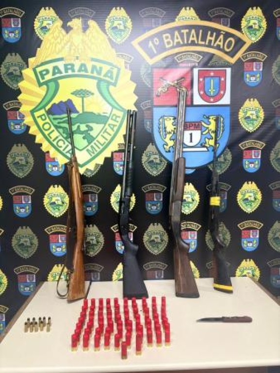 A Polícia Militar do Paraná (PMPR), por meio de equipe do 1º Batalhão de Polícia Militar (1º BPM), atendeu na noite do dia 22 de março, por volta das 19h20, uma ocorrência de violência doméstica nas proximidades da rodovia BR-373, que resultou na apreensão de diversas armas de fogo e munições.