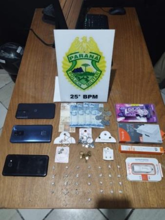 Na abordagem, foram encontrados R$ 64,00 em dinheiro, dois celulares e diversos produtos novos sem procedência, como barbeadores, carregadores e bijuterias. Nas proximidades, também foram localizadas 29 pedras de crack escondidas. Com ela ainda foram encontradas uma pedra bruta de crack pesando aproximadamente 17 gramas, quantidade suficiente para o preparo de cerca de 150 porções da droga.