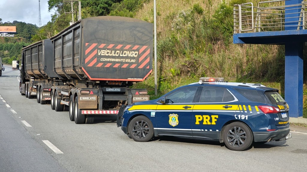 A Polícia Rodoviária Federal (PRF) recolheu ao pátio um bitrem com 94,3 toneladas na BR-376 e diversas irregularidades, na BR-376 em Tijucas do Sul (PR).
